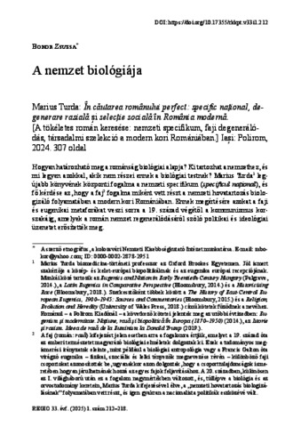 Bokor, Zsuzsa (2025) A nemzet biológiája : Marius Turda: În căutarea românului perfect: specific național, degenerare rasială și selecție socială în România modernă. [A tökéletes román keresése: nemzeti specifikum, faji degenerálódás, társadalmi szelekció a modern kori Romániában.] Iași: Polirom, 2024. 307 oldal. REGIO: KISEBBSÉG KULTÚRA POLITIKA TÁRSADALOM, 33 (1). pp. 212-218. ISSN 0865-557X
