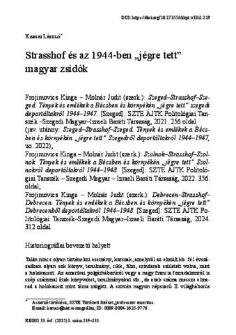 Frojimovics Kinga – Molnár Judit (szerk.): Szeged–Strasshof–Szeged. Tények és emlékek a Bécsben és környékén „jégre tett” szegedideportáltakról 1944–1947. [Szeged]: SZTE ÁJTK Politológiai Tanszék –Szegedi Magyar–Izraeli Baráti Társaság, 2021. 256 oldal(jav. utánny.: Szeged–Strasshof–Szeged. Tények és emlékek a Bécsben és környékén „jégre tett” Szegedről deportáltakról 1944–1947,uo. 2022);Frojimovics Kinga – Molnár Judit (szerk.): Szolnok–Strasshof–Szolnok. Tények és emlékek a Bécsben és környékén „jégre tett” Szolnokról deportáltakról 1944–1948. [Szeged]: SZTE ÁJTK Politológiai Tanszék – Szegedi Magyar – Izraeli Baráti Társaság, 2022. 356.oldal;Frojimovics Kinga – Molnár Judit (szerk.): Debrecen–Strasshof–Debrecen. Tények és emlékek a Bécsben és környékén „jégre tett”Debrecenből deportáltakról 1944–1948. [Szeged]: SZTE ÁJTK Politológiai Tanszék–Szegedi Magyar–Izraeli Baráti Társaság, 2024.312 oldal