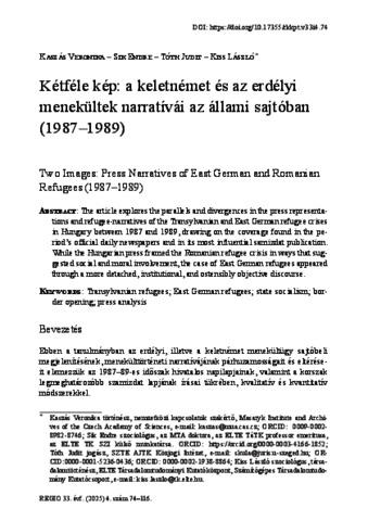 Kaszás, Veronika and Sik, Endre and Tóth, Judit and Kiss, László (2025) Kétféle kép: a keletnémet és az erdélyi menekültek narratívái az állami sajtóban (1987–1989). REGIO: KISEBBSÉG KULTÚRA POLITIKA TÁRSADALOM, 33 (4). pp. 74-116. ISSN 0865-557X