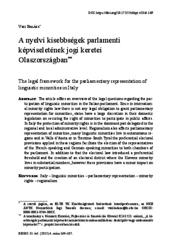 Vizi, Balázs (2025) A nyelvi kisebbségek parlamenti képviseletének jogi keretei Olaszországban. REGIO: KISEBBSÉG KULTÚRA POLITIKA TÁRSADALOM, 33 (4). pp. 169-184. ISSN 0865-557X