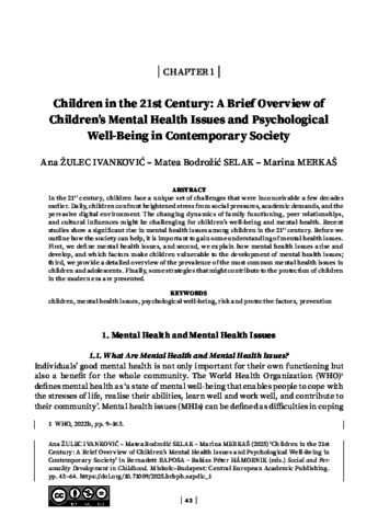 Žulec, Ivanković Ana and Bodrožić, Selak Matea and Merkaš, Marina (2025) Children in the 21st Century: A Brief Overview of Children’s Mental Health Issues and Psychological Well-Being in Contemporary SocietyChildren in the 21st Century: A Brief Overview of Children’s Mental Health Issues and Psychological Well-Being in Contemporary Society. In: Social and Personality Development in Childhood. Human Rights – Children’s Rights . Central European Academic Publishing, Budapest, pp. 43-64. ISBN 9786157027008