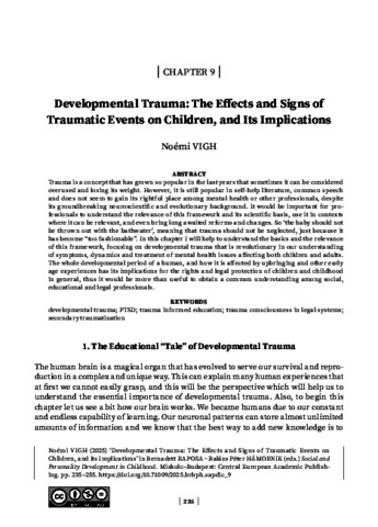 Vigh, Noémi (2025) Developmental Trauma: The Effects and Signs of Traumatic Events on Children, and Its Implications. In: Social and Personality Development in Childhood. Human Rights – Children’s Rights . Central European Academic Publishing, Budapest, pp. 235-255. ISBN 9786157027008