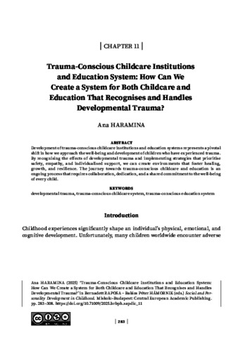 Haramina, Ana (2025) Trauma-Conscious Childcare Institutions and Education System: How Can We Create a System for Both Childcare and Education That Recognises and Handles Developmental Trauma? In: Social and Personality Development in Childhood. Human Rights – Children’s Rights . Central European Academic Publishing, Budapest, pp. 283-308. ISBN 9786157027008