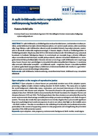 Katona, Enikő Julia (2025) A nyílt örökbeadás mint a reproduktív méltányosság határhelyzete. ESÉLY: TÁRSADALOM ÉS SZOCIÁLPOLITIKAI FOLYÓIRAT, 36 (1). pp. 30-44. ISSN 0865-0810