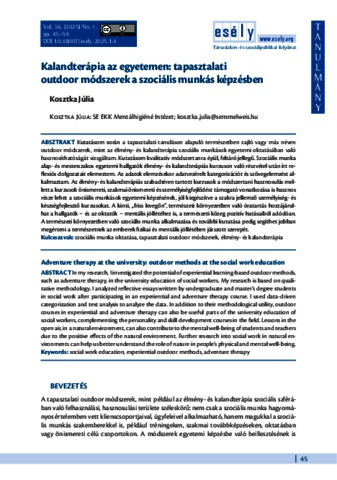 Kosztka, Júlia (2025) Kalandterápia az egyetemen : tapasztalati outdoor módszerek a szociális munkás képzésben. ESÉLY: TÁRSADALOM ÉS SZOCIÁLPOLITIKAI FOLYÓIRAT, 36 (1). pp. 45-59. ISSN 0865-0810