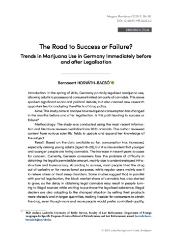 Horváth-Bacsó, Bernadett (2025) The Road to Success or Failure? : Trends in Marijuana Use in Germany Immediately before and after Legalisation. MAGYAR RENDÉSZET, 25 (3). pp. 39-50. ISSN 1586-2895
