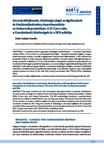 Kolin-Sabján, Katalin (2025) Innovációfejlesztés, közösségi alapú szolgáltatások és kiadásteljesítmény-összehasonlítás az önkormányzatokban: A D-Care Labs, a Gondoskodó közösségek és a SEN példája. ESÉLY: TÁRSADALOM ÉS SZOCIÁLPOLITIKAI FOLYÓIRAT, 36 (3). pp. 27-39. ISSN 0865-0810