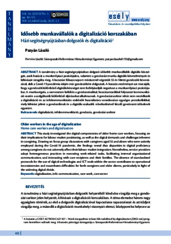 Patyán, László (2025) Idősebb munkavállalók a digitalizáció korszakában. Házi segítségnyújtásban dolgozók és digitalizáció. ESÉLY: TÁRSADALOM ÉS SZOCIÁLPOLITIKAI FOLYÓIRAT, 36 (3). pp. 40-55. ISSN 0865-0810