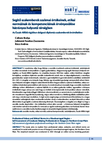 Czibere, Ibolya and Juhászné Fazekas, Zsuzsanna and Rácz, Andrea (2025) Segítő szakemberek szakmai értékeinek, etikai normáinak és kompetenciáinak érvényesülése hátrányos helyzetű térségben : Az Észak-Alföld régióban dolgozó diplomás szakemberek önértékelése. ESÉLY: TÁRSADALOM ÉS SZOCIÁLPOLITIKAI FOLYÓIRAT, 36 (4). pp. 19-44. ISSN 0865-0810