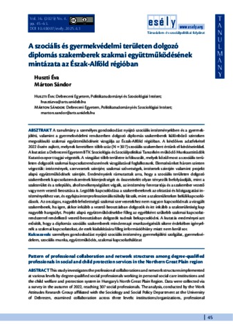 Huszti, Éva and Márton, Sándor József (2025) A szociális és gyermekvédelmi területen dolgozó diplomás szakemberek szakmai együttműködésének mintázata az Észak-Alföld régióban. ESÉLY: TÁRSADALOM ÉS SZOCIÁLPOLITIKAI FOLYÓIRAT, 36 (4). pp. 45-63. ISSN 0865-0810