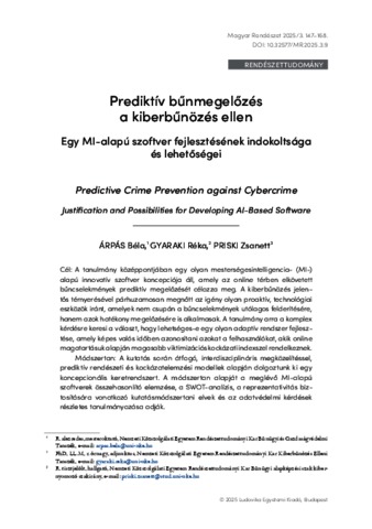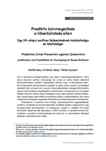 Cél: A tanulmány középpontjában egy olyan mesterségesintelligencia- (MI-) alapú innovatív szoftver koncepciója áll, amely az online térben elkövetett bűncselekmények prediktív megelőzését célozza meg. A kiberbűnözés jelentős térnyerésével párhuzamosan megnőtt az igény olyan proaktív, technológiai eszközök iránt, amelyek nem csupán a bűncselekmények utólagos felderítésére, hanem azok hatékony megelőzésére is alkalmasak. A tanulmány arra a komplex kérdésre keresi a választ, hogy lehetséges-e egy olyan adaptív rendszer fejlesztése, amely képes valós időben azonosítani azokat a felhasználókat, akik online magatartásuk alapján magasabb viktimizációs kockázati indexszel rendelkeznek.Módszertan: A kutatás során átfogó, interdiszciplináris megközelítéssel, prediktív rendészeti és kockázatelemzési modellek alapján dolgoztunk ki egy koncepcionális keretrendszert. A módszertan alapját a meglévő MI-alapú szoftverek összehasonlító elemzése, a SWOT-analízis, a reprezentativitás biztosítására vonatkozó kutatásmódszertani elvek és az adatvédelmi kérdések részletes tanulmányozása adják.Megállapítások: A kutatás rámutatott, hogy egy intelligens szoftver képes lehet az online jelenlét kockázati tényezőinek azonosítására, és a felhasználói viselkedés mintázatai alapján személyre szabott prevenciós javaslatokat nyújtani. Ez jelentősen elősegítheti a tudatos internethasználatot és hatékonyabbá teheti a bűnmegelőzési stratégiákat.Érték: A tanulmány eredményei alapján egyértelműen elmondható, hogy az MI-alapú, prediktív szoftverek jelentős szerepet tölthetnek be a jövő rendészeti stratégiáiban. A jövőbeli kutatási irányok prioritásai között szerepel a gyakorlati implementáció, a normatív keretrendszer fejlesztése és az etikai aspektusok szisztematikus integrálása. | Aim: The study focuses on the concept of an innovative artificial intelligence (AI)-based software for predictive prevention of crime in the online space. The significant rise of cybercrime has been accompanied by an increased demand for proactive technological tools that are not only capable of detecting crimes after the fact, but also of effectively preventing them. This study addresses the complex question of whether it is possible to develop an adaptive system that can identify in real time users who have a higher risk of victimisation based on their online behaviour. Methodology: A conceptual framework was developed using a comprehensive, interdisciplinary approach based on predictive policing and risk analysis models. The methodology is based on a comparative analysis of existing AI-based software, a SWOT analysis, research methodological principles to ensure representativeness, and a detailed study of privacy issues. Findings: Research has shown that intelligent software can identify risk factors for online presence and provide personalised prevention recommendations based on user behaviour patterns. This could significantly promote conscious internet use and make crime prevention strategies more effective. Value: Based on the results of the study, it is clear that AI-based predictive software can play a significant role in future law enforcement strategies. Priorities for future research directions include practical implementation, the development of a normative framework and the systematic integration of ethical aspects.