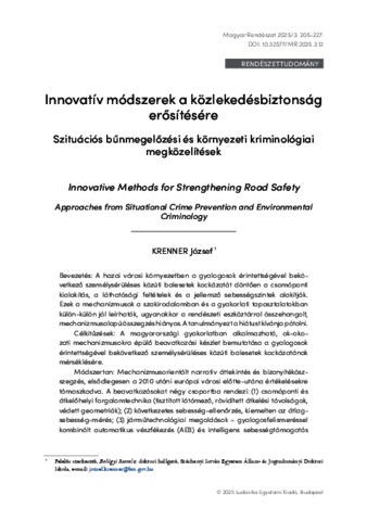 Krenner, József (2025) Innovatív módszerek a közlekedésbiztonság erősítésére : Szituációs bűnmegelőzési és környezeti kriminológiai megközelítések = Innovative Methods for Strengthening Road Safety : Approaches from Situational Crime Prevention and Environmental Criminology. MAGYAR RENDÉSZET, 25 (3). pp. 205-227. ISSN 1586-2895