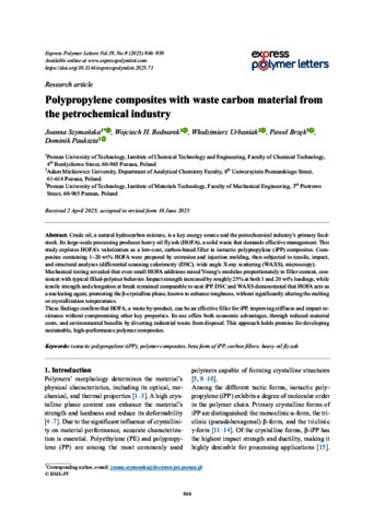 Szymanska, Joanna and Bednarek, Wojciech H. and Urbaniak, Wlodzimierz and Brzek, Pawel and Paukszta, Dominik (2025) Polypropylene composites with waste carbon material from the petrochemical industry. EXPRESS POLYMER LETTERS, 19 (9). pp. 946-958. ISSN 1788-618X