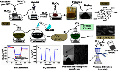 Magnetically active membranes based on GO/Fe3O4and Ag-GO/Fe3O4have been synthesized via the resin-infiltration technique, achieving significant improvements in rejection and antifouling properties, followed by their characterization by X-ray diffraction (XRD), Fourier transform infrared spectroscopy (FTIR), scanning electron microscopy (SEM), energy dispersive X-rays spectroscopy (EDX) and thermal gravimetric analysis (TGA). The increasing demand for efficient water purification technologies is challenged by low separation efficiency, poor resistance to fouling, and limited tunability in dynamic environments, as well as low rejection performance. This study addresses the research gap by developing and evaluating GO/Fe3O4and Ag-GO/Fe3O4membranes to enhance water treatment performance through improved rejection rates and antifouling capabilities. It exhibits separation efficiency, fouling resistance, and high thermomechanical stability with the added advantage of magnetic responsiveness – a combination that addresses multiple persistent issues in membrane-based water treatment. GO/Fe3O4 and Ag-GO/Fe3O4 improved the flux recovery ratio of pristine PVDF-co-HFP membrane from 50.8 to 89.9 and 92.3%, while the rejection % of paraquat (PQ) herbicide increased up to 92.7%. This research is important because magnetically active membranes do not need external magnetic fields to move the magnetic particles to the membrane’s surface.