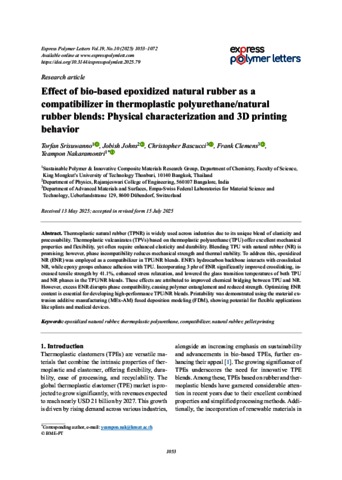 Srisuwanno, Torfan and Johns, Jobish and Bascucci, Christopher and Clemens, Frank and Nakaramontri, Yeampon (2025) Effect of bio-based epoxidized natural rubber as a compatibilizer in thermoplastic polyurethane/natural rubber blends: Physical characterization and 3D printing behavior. EXPRESS POLYMER LETTERS, 19 (10). pp. 1053-1072. ISSN 1788-618X