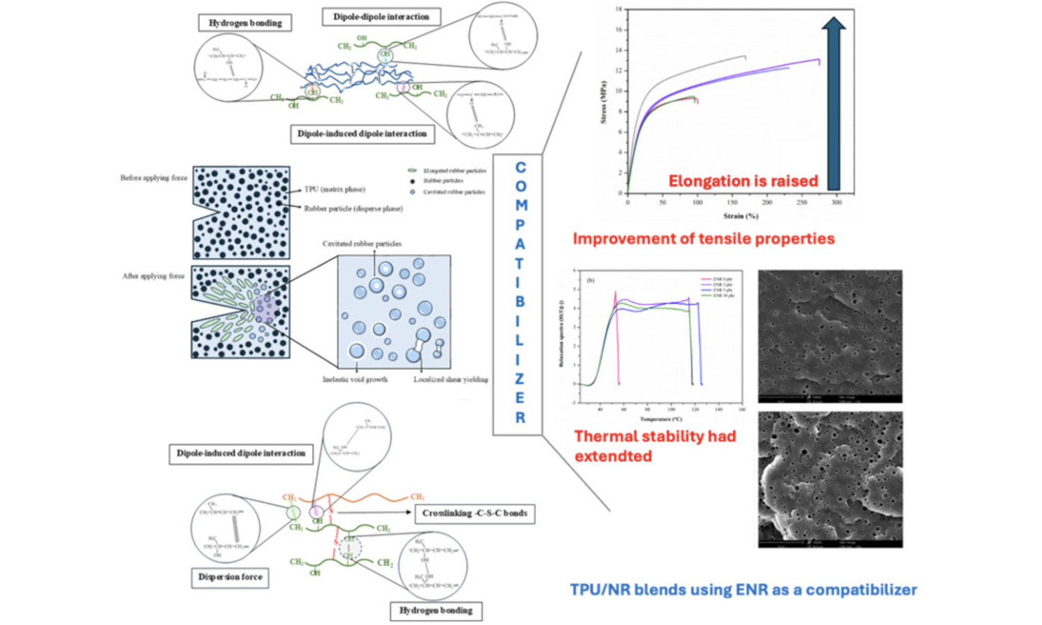 Thermoplastic natural rubber (TPNR) is widely used across industries due to its unique blend of elasticity and processability. Thermoplastic vulcanizates (TPVs) based on thermoplastic polyurethane (TPU) offer excellent mechanical properties and flexibility, yet often require enhanced elasticity and durability. Blending TPU with natural rubber (NR) is promising; however, phase incompatibility reduces mechanical strength and thermal stability. To address this, epoxidized NR (ENR) was employed as a compatibilizer in TPU/NR blends. ENR’s hydrocarbon backbone interacts with crosslinked NR, while epoxy groups enhance adhesion with TPU. Incorporating 3 phr of ENR significantly improved crosslinking, increased tensile strength by 41.1%, enhanced stress relaxation, and lowered the glass transition temperatures of both TPU and NR phases in the TPU/NR blends. These effects are attributed to improved chemical bridging between TPU and NR. However, excess ENR disrupts phase compatibility, causing polymer entanglement and reduced strength. Optimizing ENR content is essential for developing high-performance TPU/NR blends. Printability was demonstrated using the material extrusion additive manufacturing (MEx-AM) fused deposition modeling (FDM), showing potential for flexible applications like splints and medical devices.