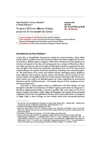 Szelényi, Iván and Melegh, Attila and Mihályi, Péter (2025) The world in 2025 from a Weberian - Polanyian perspective: An interview with Iván Szelényi. INTERSECTIONS: EAST EUROPEAN JOURNAL OF SOCIETY AND POLITICS, 11 (3). pp. 161-183. ISSN 2416-089X