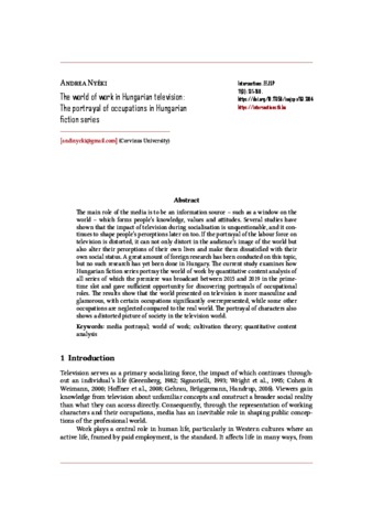 The main role of the media is to be an information source – such as a window on the world – which forms people’s knowledge, values and attitudes. Several studies have shown that the impact of television during socialisation is unquestionable, and it continues to shape people’s perceptions later on too. If the portrayal of the labour force on television is distorted, it can not only distort in the audience’s image of the world but also alter their perceptions of their own lives and make them dissatisfied with their own social status. A great amount of foreign research has been conducted on this topic, but no such research has yet been done in Hungary. The current study examines how Hungarian fiction series portray the world of work by quantitative content analysis of all series of which the premiere was broadcast between 2015 and 2019 in the prime-time slot and gave sufficient opportunity for discovering portrayals of occupational roles. The results show that the world presented on television is more masculine and glamorous, with certain occupations significantly overrepresented, while some other occupations are neglected compared to the real world. The portrayal of characters also shows a distorted picture of society in the television world.