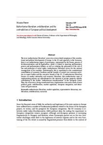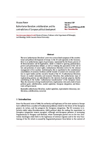 The term ‘authoritarian liberalism’ covers two crisis-related symptoms of the constitutional and political development of Europe. In the EU and especially in the Eurozone, there is an authoritarian aspect of governance, represented by the binary process of de-democratization and de-legalization, which is related to ignoring parliamentary powers and parliamentary debates, as well as violating the guarantees of the rule of law and protection of social rights. Authoritarian liberalism strives for the rational management of free markets. Institutionally, this is manifested in the constitutional consolidation of economic freedoms and the transfer of control over economic activities to expert bodies and the executive branch of the EU. If authoritarian liberalism focuses on market rationality and economic liberalism, then authoritarian ways of implementing policies are subordinated to the interests of private property, thereby contributing to the further “authoritarian transformation” of the European Union. Thus, the eurocrisis is being transformed into a legitimation crisis and a clash of main political goals: ordoliberalism, market capitalism, European integration, and democratic self-government.