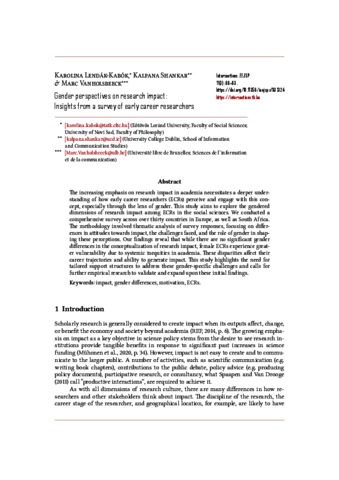 Lendák-Kabók, Karolina and Shankar, K. and Vanholsbeeck, M. (2025) Gender perspectives on research impact : Insights from a survey of early career researchers. INTERSECTIONS: EAST EUROPEAN JOURNAL OF SOCIETY AND POLITICS, 11 (3). pp. 66-83. ISSN 2416-089X