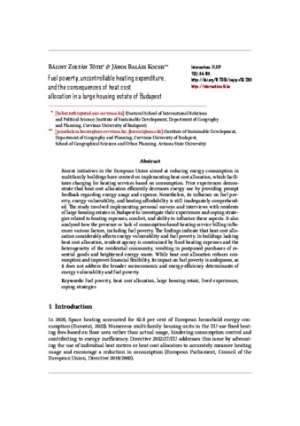 Tóth, Bálint Zoltán and Kocsis, János Balázs (2025) Fuel poverty, uncontrollable heating expenditure, and the consequences of heat cost allocation in a large housing estate of Budapest. INTERSECTIONS: EAST EUROPEAN JOURNAL OF SOCIETY AND POLITICS, 11 (3). pp. 84-108. ISSN 2416-089X