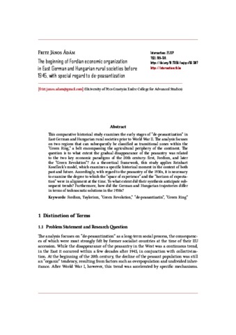 This comparative historical study examines the early stages of “de-peasantization” in East German and Hungarian rural societies prior to World War II. The analysis focuses on two regions that can subsequently be classified as transitional zones within the “Green Ring,” a belt encompassing the agricultural periphery of the continent. The question is to what extent the gradual disappearance of the peasantry was related to the two key economic paradigms of the 20th century: first, Fordism, and later the “Green Revolution”? As a theoretical framework, this study applies Reinhart Koselleck’s model, which examines a specific historical moment in the context of both past and future. Accordingly, with regard to the peasantry of the 1930s, it is necessary to examine the degree to which the “space of experience” and the “horizon of expectation” were in alignment at the time. To what extent did their synthesis anticipate subsequent trends? Furthermore, how did the German and Hungarian trajectories differ in terms of technocratic solutions in the 1930s?