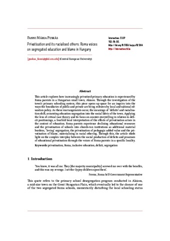 Puskás, Fanni Mária (2025) Privatisation and its racialised others : Roma voices on segregated education and blame in Hungary. INTERSECTIONS: EAST EUROPEAN JOURNAL OF SOCIETY AND POLITICS, 11 (2). pp. 119-135. ISSN 2416-089X