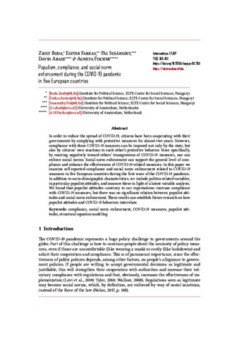 Boda, Zsolt and Farkas, Eszter and Susánszky, Pál and Abadi, David and Fischer, Agneta (2025) Populism, compliance, and social norm enforcement during the COVID-19 pandemic in five European countries. INTERSECTIONS: EAST EUROPEAN JOURNAL OF SOCIETY AND POLITICS, 11 (2). pp. 165-182. ISSN 2416-089X