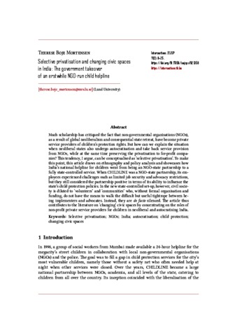 Mortensen, Therese Boje (2025) Selective privatisation and changing civic spaces in India: The government takeover of an erstwhile NGO-run child helpline. INTERSECTIONS: EAST EUROPEAN JOURNAL OF SOCIETY AND POLITICS, 11 (2). pp. 8-25. ISSN 2416-089X