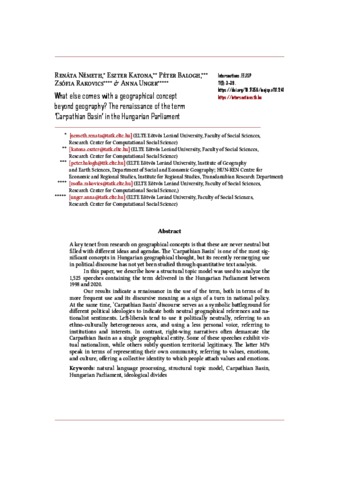 Németh, Renáta and Katona, Eszter Rita and Balogh, Péter and Rakovics, Zsófia and Unger, Anna (2025) What else comes with a geographical concept beyond geography? The renaissance of the term ‘Carpathian Basin’ in the Hungarian Parliament. INTERSECTIONS: EAST EUROPEAN JOURNAL OF SOCIETY AND POLITICS, 11 (1). pp. 3-39. ISSN 2416-089X