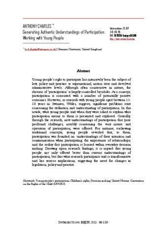 Charles, Anthony (2017) Generating Authentic Understandings of Participation: Working with Young People. INTERSECTIONS: EAST EUROPEAN JOURNAL OF SOCIETY AND POLITICS, 3 (1). pp. 96-119. ISSN 2416-089X