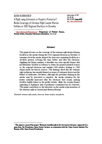 The paper focuses on the coverage of the extreme right leader Marian Kotleba in the media during the 2013 regional elections in Slovakia. It examines how the media shaped the discourse regarding Kotleba in a six-week period, covering the time before and after the elections. Applying the frame analysis, it identifies ten issue-specific frames that problematize Kotleba in relation to either his general political actions or the regional elections and analyses 359 articles, leading to 1095 claims made by various sources. The findings show that the extreme right politician was mainly framed in terms of extremist threat and the failure of authorities. However, although the prevalent framing in the media may be perceived as negative, the media attention for the leader radically increased after the elections’ first round, making Kotleba highly salient in the public debate, while the counter-frames appealing to legitimate side of politician’s candidacy can be observed. The paper contributes to the literature on the media representation of the extreme right in Central and Eastern Europe.