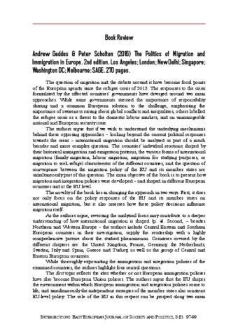 Éger, András (2017) Andrew Geddes & Peter Scholten (2016) The Politics of Migration and Immigration in Europe. . 2nd edition. Los Angeles; London; New Delhi; Singapore; Washington DC; Melbourne: SAGE. 270 pages. INTERSECTIONS: EAST EUROPEAN JOURNAL OF SOCIETY AND POLITICS, 3 (2). pp. 97-99. ISSN 2416-089X