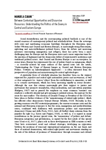 Manuela, Caiani (2017) Between Contextual Opportunities and Discursive Resources : Understanding the Politics of the Enemy in Central and Eastern Europe. INTERSECTIONS: EAST EUROPEAN JOURNAL OF SOCIETY AND POLITICS, 3 (3). pp. 5-13. ISSN 2416-089X