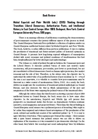 Wawrzyński, Patryk (2017) Michal Kopeček and Piotr Wciślik (eds.) (2015) Thinking through Transition: Liberal Democracy, Authoritarian Pasts, and Intellectual History in East Central Europe After 1989. Budapest, New York: Central European University Press. INTERSECTIONS: EAST EUROPEAN JOURNAL OF SOCIETY AND POLITICS, 3 (3). pp. 148-152. ISSN 2416-089X