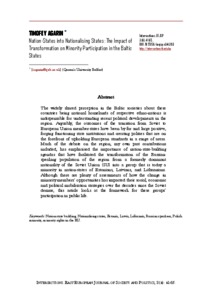 The widely shared perception in the Baltic societies about these countries being national homelands of respective ethno-nations is indispensable for understanding recent political developments in the region. Arguably, the outcomes of the transition from Soviet to European Union member-states have been by far and large positive, forging functioning state institutions and creating polities that are on the forefront of upholding European standards in a range of areas. Much of the debate on the region, my own past contributions included, has emphasised the importance of nation-state-building agendas that have facilitated the transformation of the Russian-speaking population of the region from a formerly dominant nationality of the Soviet Union (SU) into a group that is today a minority in nation-states of Estonians, Latvians, and Lithuanians. Although there are plenty of assessments of how the change in minority members’ opportunities has impacted their social, economic and political mobilisation strategies over the decades since the Soviet demise, this article looks at the framework for these groups’ participation in public life.