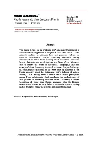 Dambrauskas, Karolis (2017) Minority Response to Ethnic Democracy : Poles in Lithuania after EU Accession. INTERSECTIONS: EAST EUROPEAN JOURNAL OF SOCIETY AND POLITICS, 3 (4). pp. 66-86. ISSN 2416-089X