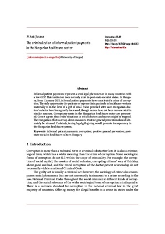 Informal patient payments represent a semi-legal phenomenon in many countries with a low GDP. This institution does not only exist in post-state-socialist states. In Hungary, from 1 January 2021, informal patient payments have constituted a crime of corruption. The only opportunity for patients to express their gratitude to healthcare workers materially is in the form of a gift of small value provided after care. Hungarian doctors’ salaries have been greatly increased, though nurses have not been remunerated in similar measure. Corrupt payments in the Hungarian healthcare sector are prosecuted. Covert agents thus create situations in which doctors and nurses might be trapped. The Hungarian efforts are top-down measures. Positive general prevention should ultimately be stressed. Certainly, taxing legal gift-giving would promote transparency in the Hungarian healthcare system.