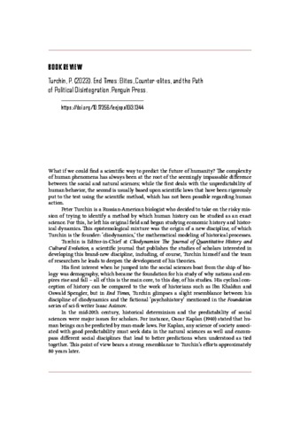 Demian, Juan Cristóbal (2024) Turchin, P. (2023). End Times: Elites, Counter-elites, and the Path of Political Disintegration. Penguin Press. INTERSECTIONS: EAST EUROPEAN JOURNAL OF SOCIETY AND POLITICS, 10 (3). pp. 253-258. ISSN 2416-089X