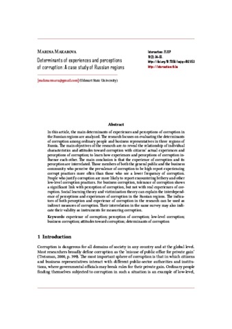 In this article, the main determinants of experiences and perceptions of corruption in the Russian regions are analyzed. The research focuses on evaluating the determinants of corruption among ordinary people and business representatives in three regions of Russia. The main objectives of the research are: to reveal the relationship of individual characteristics and attitudes toward corruption with citizens’ actual experiences and perceptions of corruption; to learn how experiences and perceptions of corruption influence each other. The main conclusion is that the experience of corruption and its perception are interrelated. Those members of both the general public and the business community who perceive the prevalence of corruption to be high report experiencing corrupt practices more often than those who see a lower frequency of corruption. People who justify corruption are more likely to report encountering bribery and other low-level corruption practices. For business corruption, tolerance of corruption shows a significant link with perception of corruption, but not with real experiences of corruption. Social learning theory and victimization theory can explain the interdependence of perceptions and experiences of corruption in the Russian regions. The indicators of both perception and experience of corruption in the research can be used as indirect measures of corruption. Their interrelation in the same survey may also indicate their validity as instruments for measuring corruption.