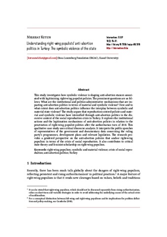 Kutun, Melehat (2024) Understanding right-wing populists' anti-abortion politics in Turkey: The symbolic violence of the state. INTERSECTIONS: EAST EUROPEAN JOURNAL OF SOCIETY AND POLITICS, 10 (2). pp. 114-131. ISSN 2416-089X