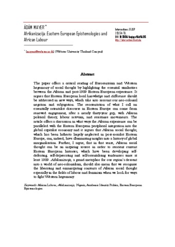 The paper offers a critical reading of Eurocentrism and Western hegemony of social thought by highlighting the essential similarities between the African and post-1989 Eastern European experience. It argues that Eastern European local knowledge and difference should be addressed in new ways, which take into account our neo-colonial negation and subjugation. The reorientation of what I call an essentially orientalist discourse in Eastern Europe can come from renewed engagement, after a nearly thirty-year gap, with African political theory, labour activism, and resistance movements. The article offers a discussion in what ways the African experience can be paralleled with the Eastern European peripheral integration into the global capitalist economy and it argues that African social thought, which has been hitherto largely neglected in post-socialist Eastern Europe, can, indeed, have illuminating insights into a history of global marginalisation. Further, I argue, that in that sense, African social thought can be an inspiring source in order to reorient current Eastern European histories, which have been developing selfdefeating, self-deprecating and self-orientalising tendencies since at least 1989. Afrikanizacija, a grand metaphor for our region’s descent into a world of neo-colonialism, should also mean that we recognise the liberating and emancipating contents of African social thought especially in the fields of labour and feminism when we look for ways to fight Western hegemony.