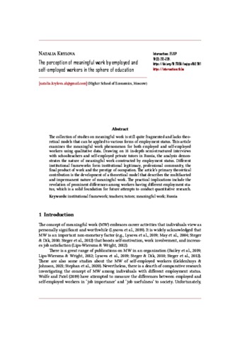 The collection of studies on meaningful work is still quite fragmented and lacks theoretical models that can be applied to various forms of employment status. This article examines the meaningful work phenomenon for both employed and self-employed workers using qualitative data. Drawing on 16 in-depth semi-structured interviews with schoolteachers and self-employed private tutors in Russia, the analysis demonstrates the nature of meaningful work constructed by employment status. Different institutional frameworks form institutional legitimacy, professional community, the final product of work and the prestige of occupation. The article's primary theoretical contribution is the development of a theoretical model that describes the multifaceted and impermanent nature of meaningful work. The practical implications include the revelation of prominent differences among workers having different employment status, which is a solid foundation for future attempts to conduct quantitative research. © (2024), (Centre for Social Sciences Hungarian Academy of Sciences). All rights reserved.