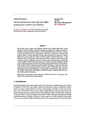 he present article explores the dynamics behind Czech radical-right leader Tomio Okamura and his Freedom and Direct Democracy (SPD) party’s frequent criticism of the West. It argues that their attacks on the West should be seen as not only a critique of liberal democracy but also a denunciation of the post-socialist socio-economic and political order in Central and Eastern Europe. The transition from socialism to liberal democracy in this region has closely tied the concept of liberal democracy to ‘the Western model’, turning discussions about the West into debates about the post-1989 transition. Using a qualitative analysis of social media communication and drawing on the insights of critical discourse analysis, the article shows how Okamura and his party use their denunciation of the West to fight against both the Western liberal democratic model and the Czech post-socialist regime. By doing so, they tap into postsocialist tropes and challenge the West–East hierarchy of knowledge. The Czech case sheds light on the regional specificity of radical right movements in Central and Eastern Europe and how their anti-Western, anti-liberal stance is influenced by issues related to the post-1989 transition.