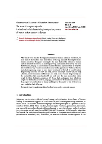 Gholampour, Faranak and Simonovits, Bori (2024) The voice of irregular migrants: A mixed-method study exploring the migration process of Iranian asylum seekers to Europe. INTERSECTIONS: EAST EUROPEAN JOURNAL OF SOCIETY AND POLITICS, 10 (1). pp. 53-79. ISSN 2416-089X