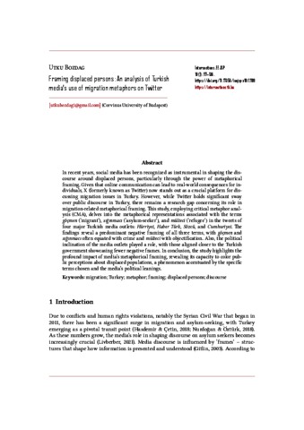 In recent years, social media has been recognized as instrumental in shaping the discourse around displaced persons, particularly through the power of metaphorical framing. Given that online communication can lead to real-world consequences for individuals, X (formerly known as Twitter) now stands out as a crucial platform for discussing migration issues in Turkey. However, while Twitter holds significant sway over public discourse in Turkey, there remains a research gap concerning its role in migration-related metaphorical framing. This study, employing critical metaphor analysis (CMA), delves into the metaphorical representations associated with the terms göçmen (‘migrant’), sığınmacı (‘asylum-seeker’), and mülteci (‘refugee’) in the tweets of four major Turkish media outlets: Hürriyet, Haber Türk, Sözcü, and Cumhuriyet. The findings reveal a predominant negative framing of all three terms, with göçmen and sığınmacı often equated with crime and mülteci with objectification. Also, the political inclination of the media outlets played a role, with those aligned closer to the Turkish government showcasing fewer negative frames. In conclusion, the study highlights the profound impact of media’s metaphorical framing, revealing its capacity to color public perceptions about displaced populations, a phenomenon accentuated by the specific terms chosen and the media’s political leanings.