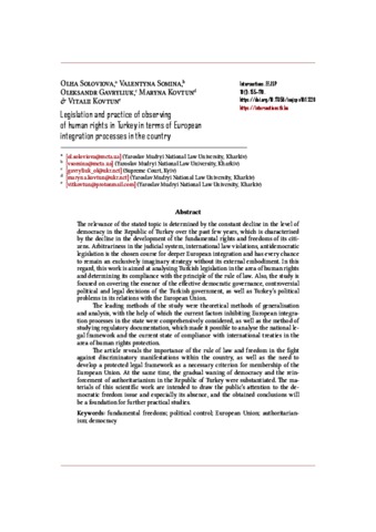 Soloviova, Olha and Somina, Valentyna and Gavryliuk, Oleksandr and Kovtun, Maryna and Kovtun, Vitalii (2024) Legislation and practice of observing of human rights in Turkey in terms of European integration processes in the country. INTERSECTIONS: EAST EUROPEAN JOURNAL OF SOCIETY AND POLITICS, 10 (1). pp. 155-170. ISSN 2416-089X