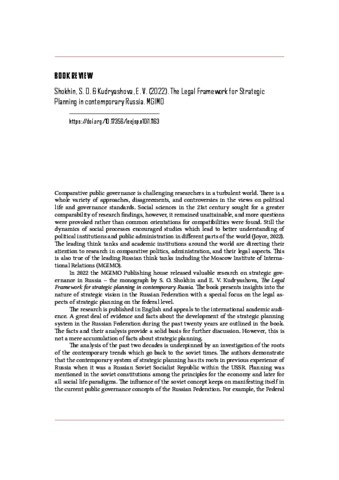 Grib, Vladislav V. and Cenerelli, Alessandro (2024) Shokhin, S. O. & Kudryashova, E. V. (2022). The Legal Framework for Strategic Planning in contemporary Russia. MGIMO. INTERSECTIONS: EAST EUROPEAN JOURNAL OF SOCIETY AND POLITICS, 10 (1). pp. 223-225. ISSN 2416-089X