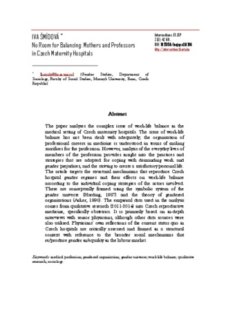The paper analyses the complex issue of work-life balance in the medical setting of Czech maternity hospitals. The issue of work-life balance has not been dealt with adequately; the organisation of professional careers in medicine is understood in terms of making sacrifices for the profession. However, analysis of the everyday lives of members of the profession provides insight into the practices and strategies that are adopted for coping with demanding work and gender prejudices, and the striving to create a satisfactory personal life. The article targets the structural mechanisms that reproduce Czech hospital gender regimes and their effects on work-life balance according to the individual coping strategies of the actors involved. These are conceptually framed using the symbolic system of the gender universe (Harding, 1987) and the theory of gendered organisations (Acker, 1990). The empirical data used in the analysis comes from qualitative research (2011-2014) into Czech reproductive medicine, specifically obstetrics. It is primarily based on in-depth interviews with senior physicians, although other data sources were also utilised. Physicians’ own reflections of the current status quo in Czech hospitals are critically assessed and framed in a structural context with reference to the broader social mechanisms that re/produce gender in/equality in the labour market.