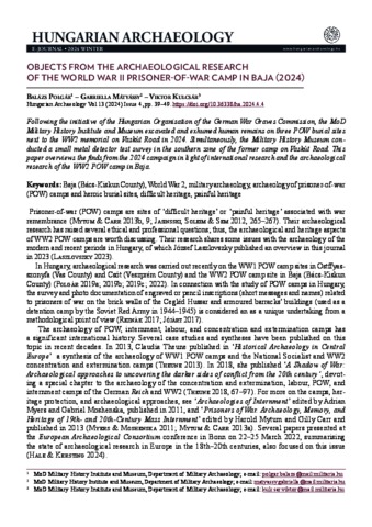 Polgár, Balázs and Mátyássy, Gabriella and Kulcsár, Viktor (2024) Objects from the archaeological research of the World War II prisoner-of-war camp in Baja (2024). HUNGARIAN ARCHAEOLOGY, 13 (4). pp. 39-49. ISSN 2416-0296